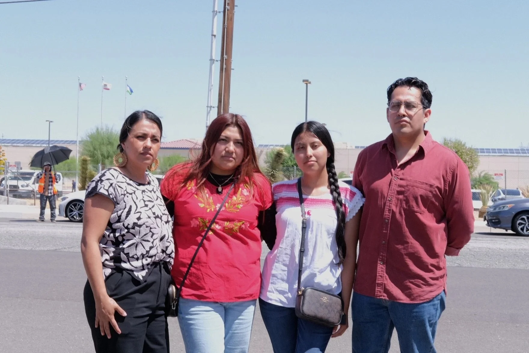 A family stands outside the Adelanto ICE Processing Center, where a relative is being held after a raid on an L.A. apparel company. Source: LAist