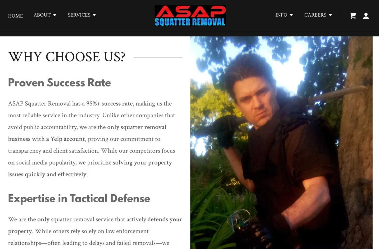 He runs a business called “ASAP Squatter Removal,” getting hired by landlords when they discover people are occupying a property without authorization. Rather than going to the police (who sometimes don’t respond), or going through a more lengthy court eviction process, they turn to Jacobs. For a fee, Jacobs will remove the squatters by any means necessary. And if force is required, he comes prepared with an arsenal of homemade melee weapons and military tactics: a sword, a “spear” he’s made out of a broomstick with knives attached to the end, flash bangs, and smoke grenades.