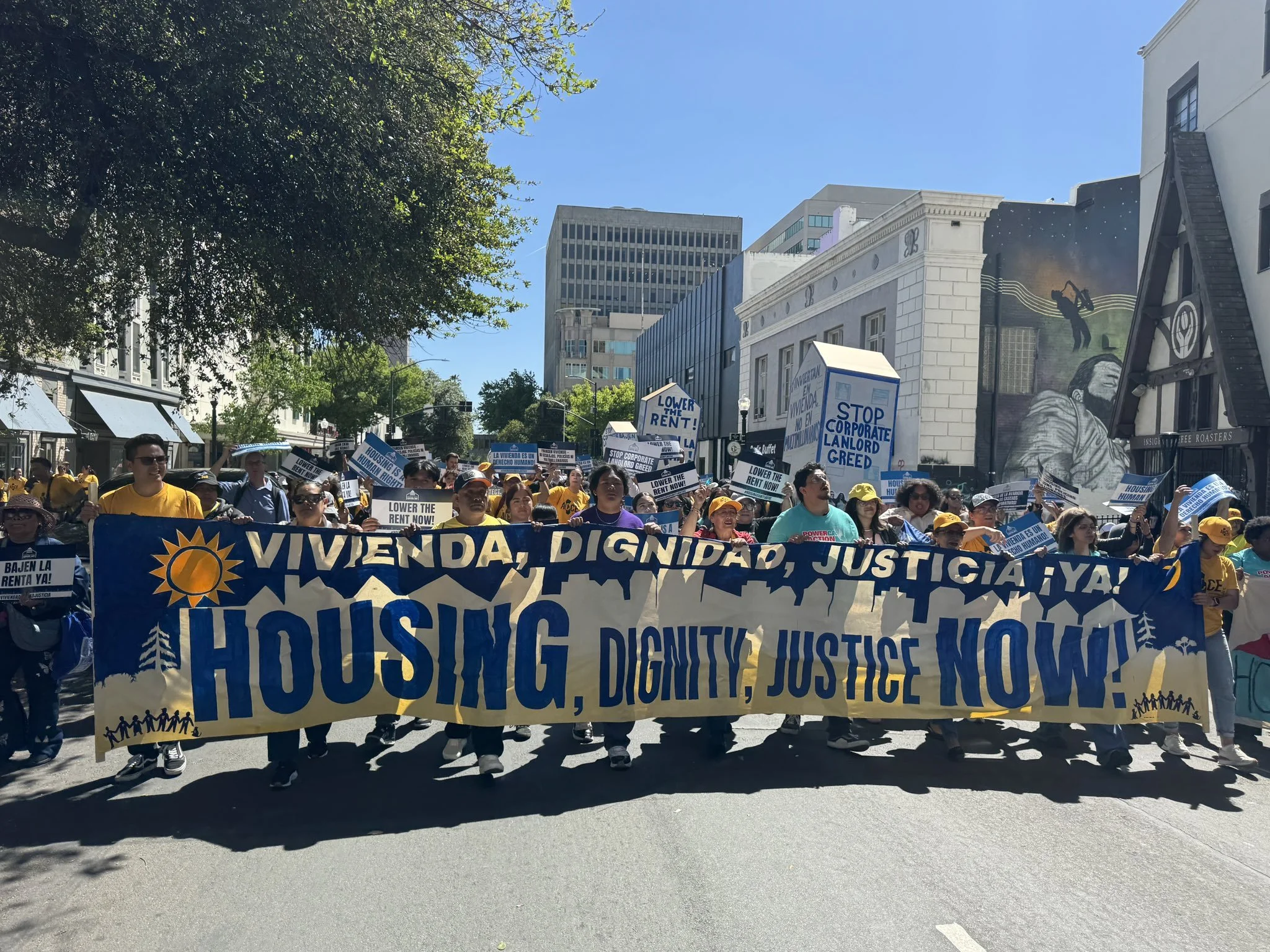 These are just small samples of the stories from over 800 people who turned out on Monday. After a press conference, the rally turned into a march, with a brass band leading the raucous crowd through the streets of Sacramento and into the offices of the California Apartment Association.